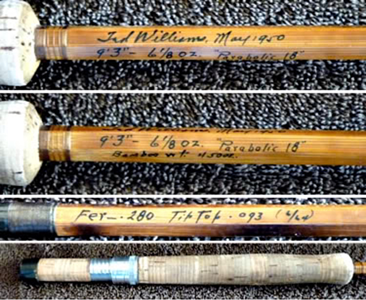 PHY “TED WILLIAMS PARABOLIC 18 FLORIDA SPECIAL”. 9’6″, 2/2. Reportedly this is the rod shown in the PHY catalog photo of Ted Williams holding a nine-pound bonefish (see photo below). Used by Ted Williams, it was returned to PHY after Williams signed with Sears, Roebuck to promote a line of fishing tackle. Detroit die-stamp on butt cap, downlocking reel seat, half Wells grip, yellow wraps, inked as follows: “Parabolic” 9 1/2′ – 5.87 oz. – .375-.281-.093 #1 of this model May 1950 Ted Williams model G.B.F. Paul H. Young – Detroit.
