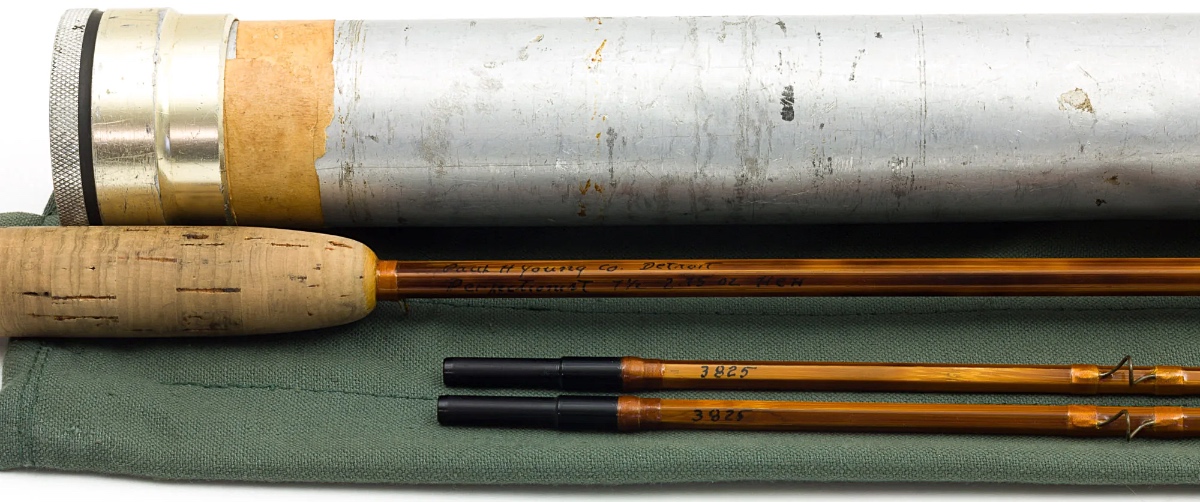 “Boat Rod” model fly rod. 8′, 2/2, 4.75 oz. Varnished and flamed cane, gold wraps. Half wells grip (appears cleaned or new), black down-lock over cork with stamped and pocketed cap. Blued 15/64″ Super-Z ferrule, tips made with 5/64″ tip tops. Refinished by Bob Summers. Inkled on four flats of the butt: Ken Johnson / Boat + Canoe Special 8′ 4.75 oz / Fer 15/64 Tip Top 5/64 Bamboo Wt. 3.xx oz / Paul H. Young Co. Detroit Mich. Period champion tube with brass collar, unusual black fabric bag. Built for Ken Johnson of Jackson, MI. Dated 1955. Listed on Bob Summers’ website November 2018 for $3,500.00. The description reads: “I refinished it about twenty years ago since. This model was was cataloged as the boat rod after 1956 Paul Young designed it for the Au Sable River guide boat.”