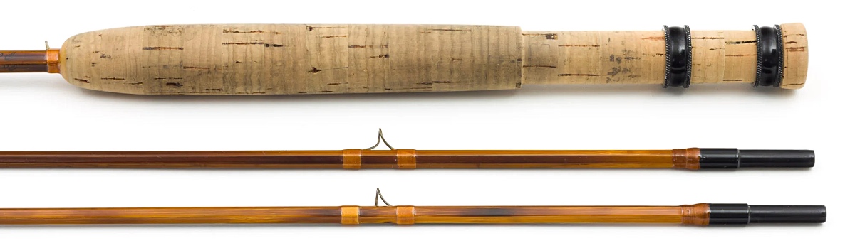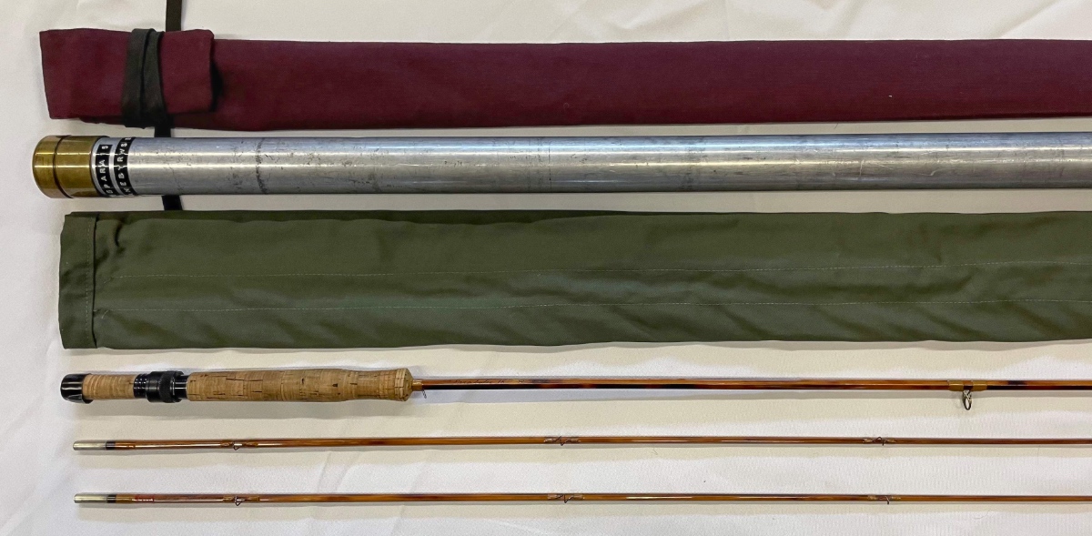 Perfectionist 7’6″ 2/2 Flamed cane, Ritz grip tapering to a conical point, dual gray rings over all-cork mortised reel seat, maroon/brown wraps tipped black at guides and hookkeeper, amber wraps tipped black at ferrules. Butt section is marked Paul H Young Co. / “Perfectionist” 7′ 6″ ~ 2 3/4 oz. Tips and butt are all marked: #4969